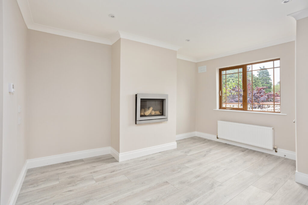 Sitting Room: Coving, recessed lighting, wooden floor, wall mounted gas fire, double doors leading to dining area