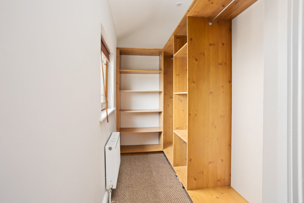 Bedroom 1: Light fitting, wall lighting, walk in wardrobe—shelved and railed, wooden venetian blinds, TV point