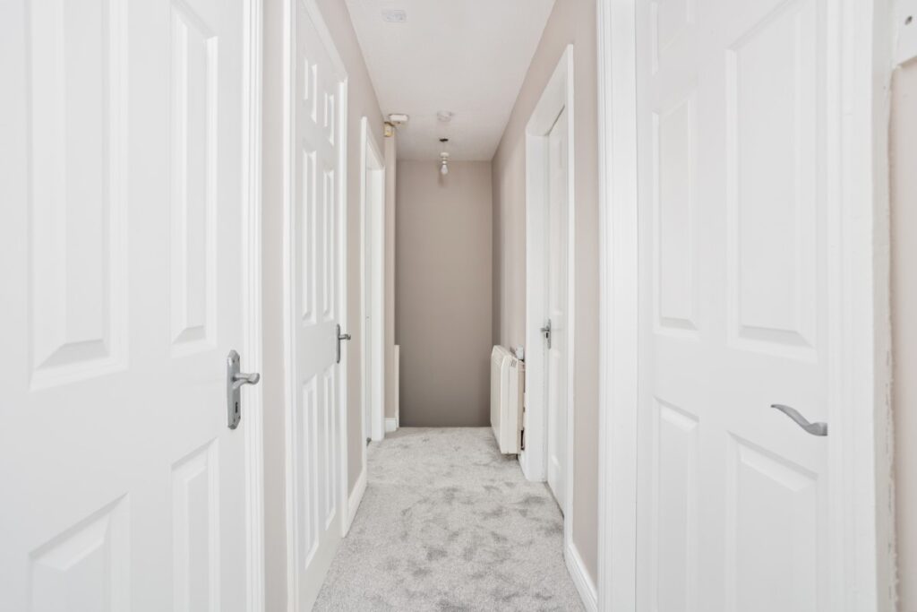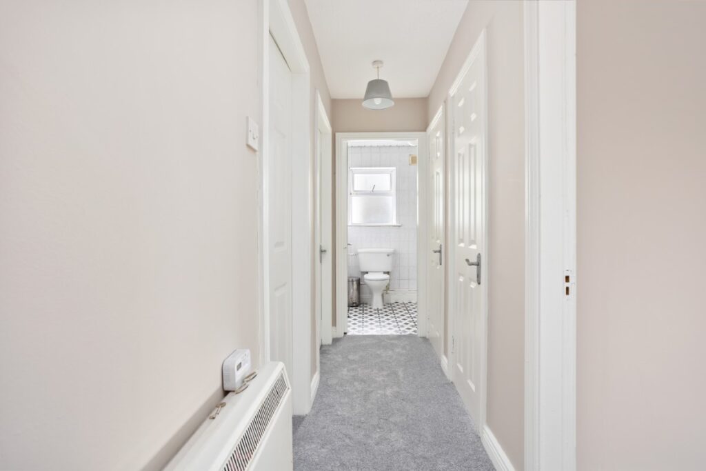 Hallway: Wooden/carpet flooring, light fitting, alarm point