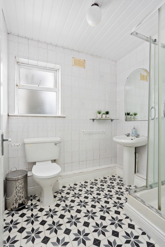 Family Bathroom: Tiled flooring, tiled surround, shower, WHB, WC